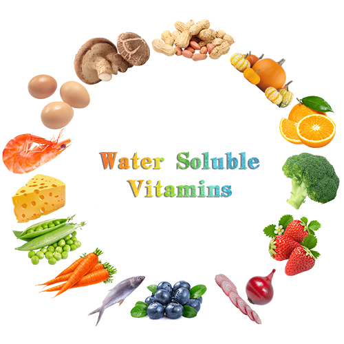 2) วิตามินที่ละลายในน้ำ ประกอบด้วย  วิตามินบี 1 บี 2 บี 3 บี 5 บี 6 บี 7 บี 9 บี 12 และวิตามินซี จะอยู่ในร่างกาย 2 – 4 ชั่วโมง วิตามินกลุ่มนี้ร่างกายจำเป็นต้องได้รับจากอาหารทุกวัน เนื่องจากร่างกายไม่สามารถสะสมวิตามินกลุ่มนี้ได้ ส่วนที่เหลือจากการใช้งานจะถูกขับออกทางไตมากับปัสสาวะ โอกาสที่จะสะสมในร่างกายจึงมีน้อยไม่ค่อยก่อผลข้างเคียง