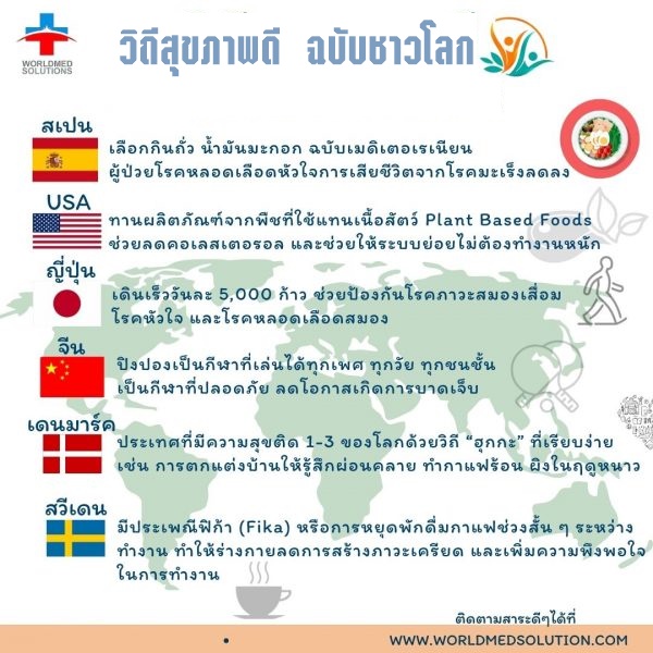 สวัสดีท่านผู้รักสุขภาพทุกท่านครับ พบกับสาระสุขภาพดีๆกับ Admin Worldmed กันอีกเช่นเคยครับ ขึ้นชื่อว่าการมีสุขภาพที่ดี ล้วนเป็นประสบการณ์ที่ทุกท่านต่างพึงประสงค์ด้วยกันทั้งสิ้น และการมีสุขภาพที่ดีนั้นจะต้องมีความสัมพันธ์ทั้งทางร่างกายและจิตใจ และท่านเคยสงสัยหรือไม่ว่าชาวต่างชาตินั้นมีเทคนิคการสร้างสุขภาพเงบวกย่างไร และคล้ายคลึงกับชาวไทยเราหรือไม่ ติดตามไปพร้อมกันครับ
