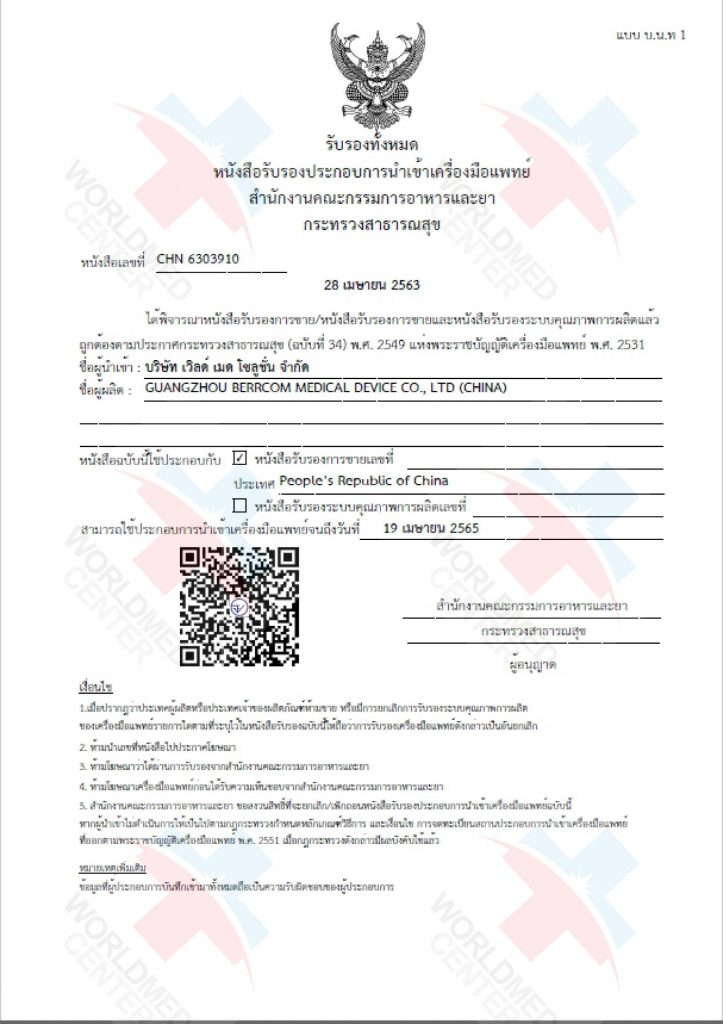 เครื่องวัดอุณหภูมิ Berrcom ของบริษัท WorldMed ทุกเครื่องผ่านการตรวจสอบ และรับรองโดยองค์การอาหารและยา ท่านสามารถขอเอกสารได้จากแอดมินของบริษัท line id: @vanessa